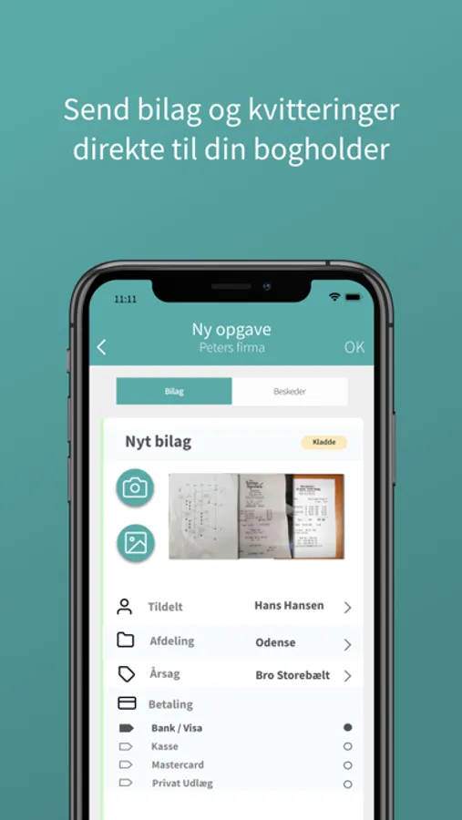 Sukstorf Bogføring er din nemme løsning til at håndtere bilag. Du kan tage billeder af dine bilag eller fakturaer og sende dem direkte til din bogholder med mulighed for at vælge afdeling, projekt, årsag og betalingsmetode.