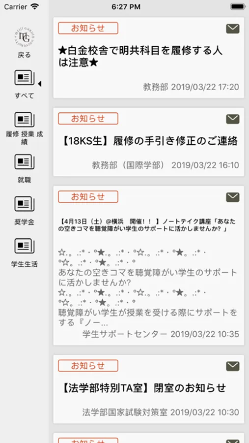 ・大学からの重要なお知らせを確認することができます