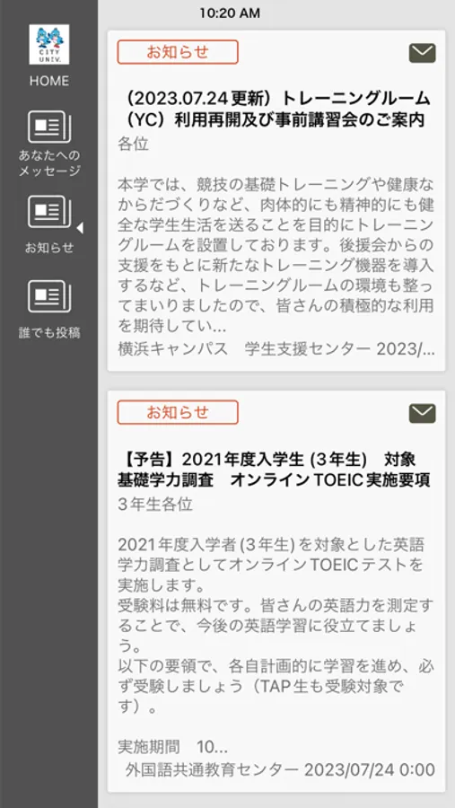 休講、補講、講義連絡、教室・教員変更など授業関連情報のチェック
