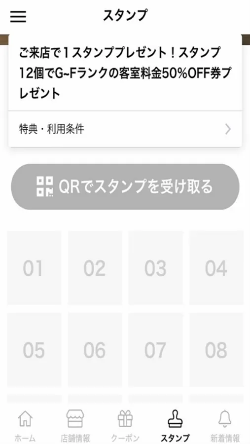 アプリスタンプをご用意致しました。来店ごとに1スタンプ付与いたします。