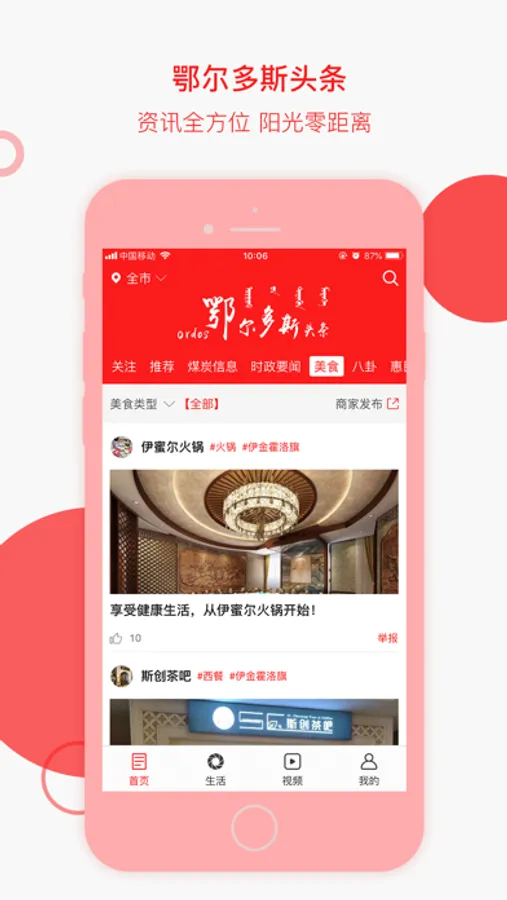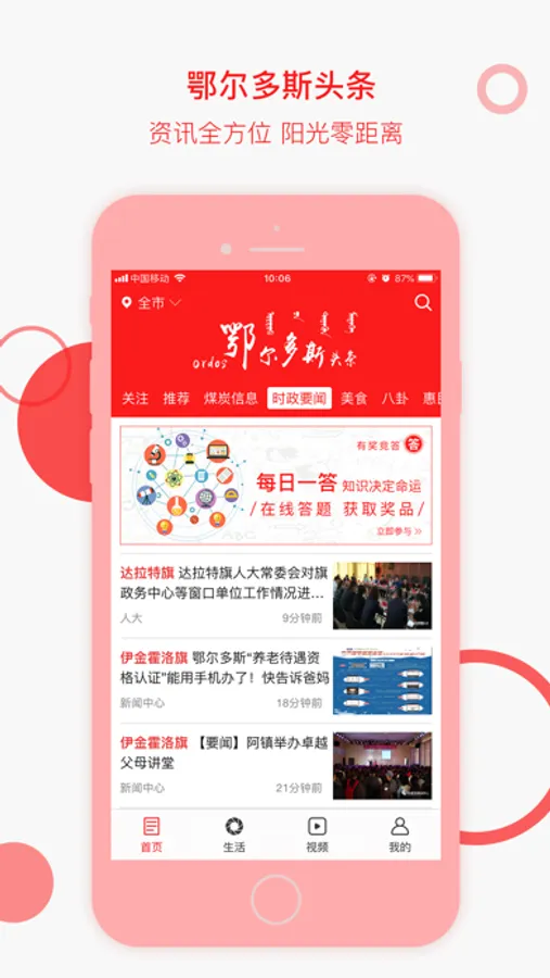 鄂尔多斯头条是整合市、旗区各类信息的新媒体平台,民众可通过鄂尔多斯头条了解全市及各旗区政务信息,便民信息,优秀企业、个体信息,目前已收集部分旗区的代表信息,后期将和市、旗区合作,民众通过阳光鄂尔多斯客户端全面了解鄂尔多斯市境内各类信息
