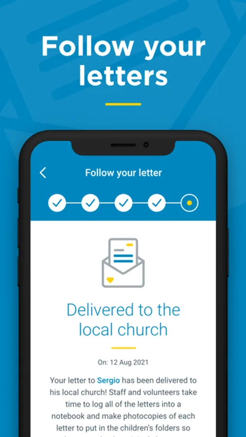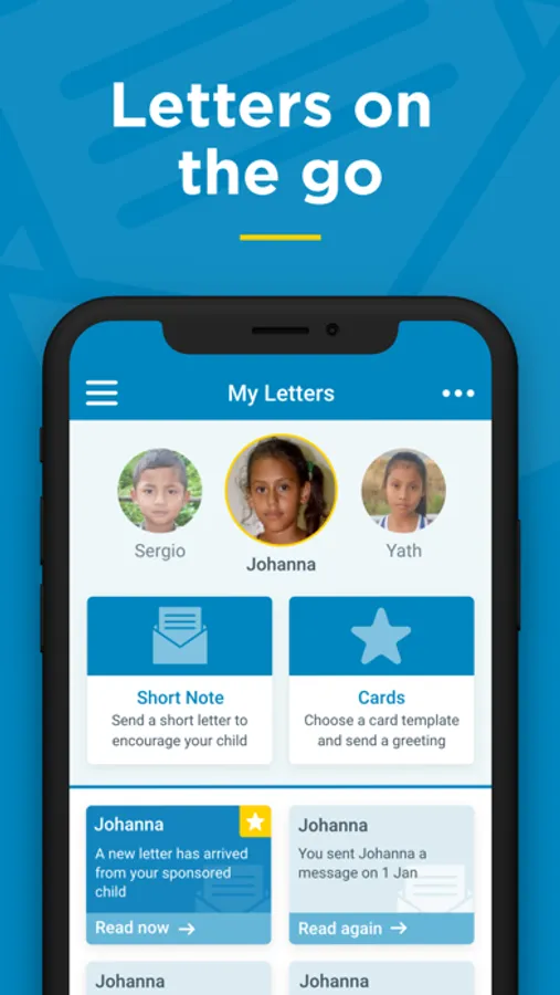 From the ease of your phone, you can explore your relationship with your sponsored child. Write messages and send gifts when you’re out and about. Receive helpful birthday reminders and letter notifications straight to your phone.