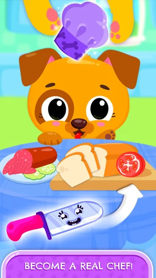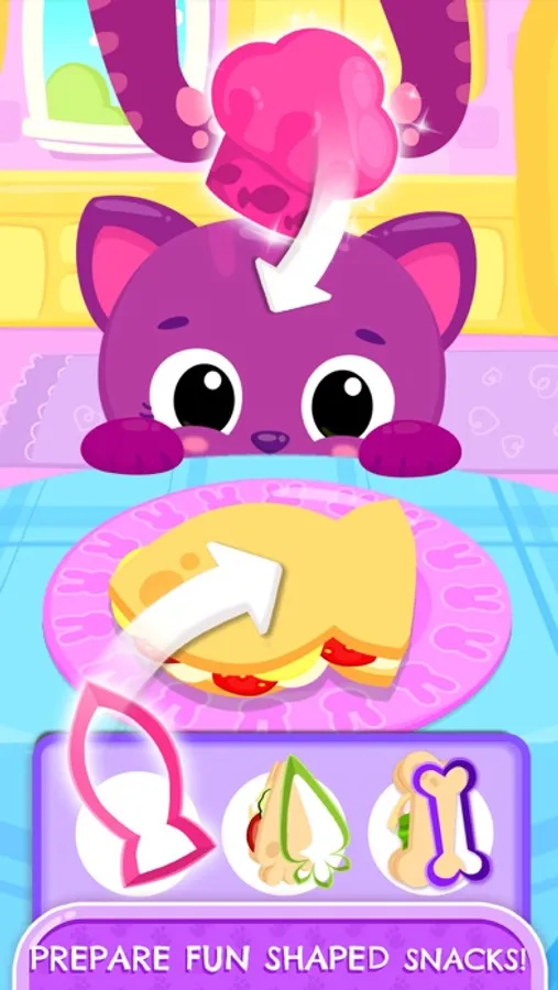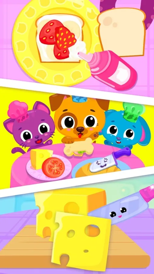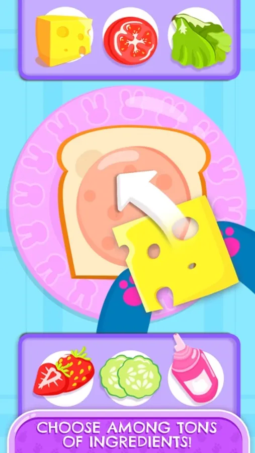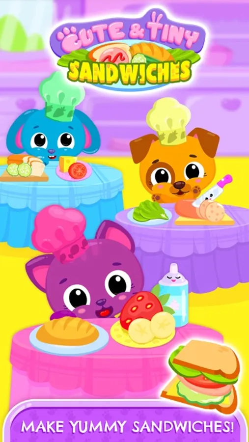 Make delicious snacks for kitty Sue, puppy Bu and bunny Blu! Prepare fun shaped vegetable, cheese, salami and even sweet sandwiches! Slice and arrange bread and other ingredients! Enjoy quick, easy and yummy lunch ideas!