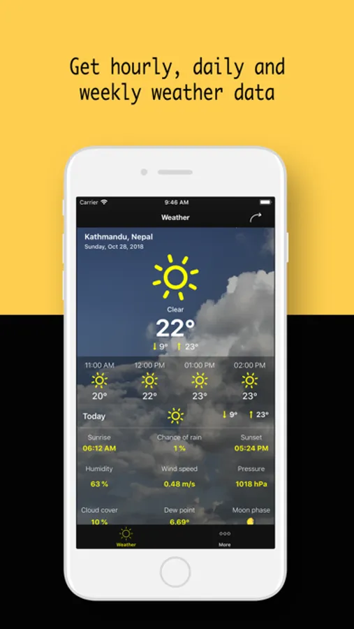 - Get details like sunrise, sunset, chance of rain, humidity, pressure, cloud cover, wind speed, moon phase etc.