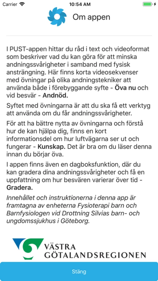 PUST-appen är framtagen av enheterna Fysioterapi barn och Barnfysiologen vid Drottning Silvias barn- och ungdomssjukhus i Göteborg, en del av Västra Götalandsregionen. Här hittar du råd och instruktioner om andningstekniker som kan användas för att minska andningssvårigheter som uppkommer i samband med fysisk ansträngning. Dessa har utarbetats i ett samarbete mellan enheterna och ges idag till barn och ungdomar med ansträngningsutlösta andningssvårigheter i samband med att lungfunktionsutredning med ansträngningsprovokation genomförs.