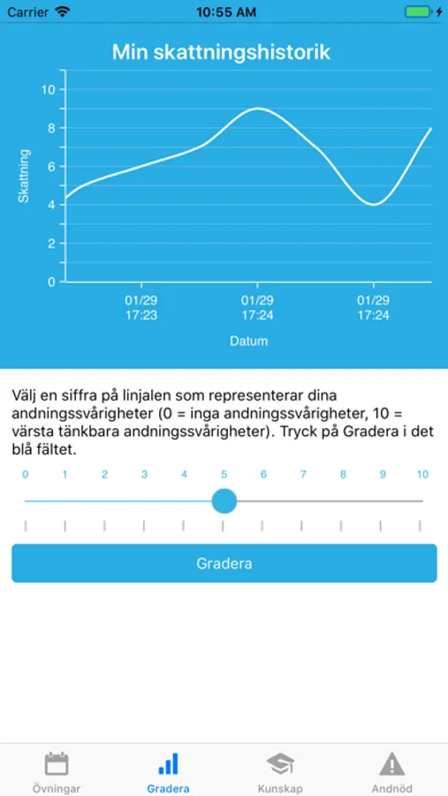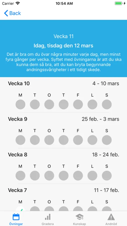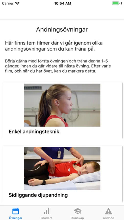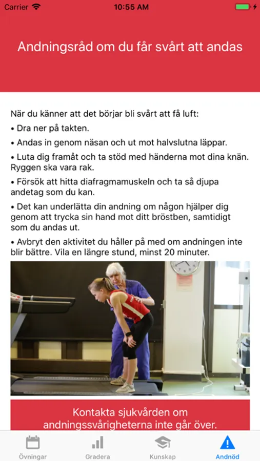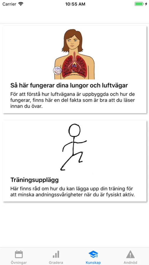 Genom att du lär dig olika andningstekniker och i vila tränar dessa, finns möjlighet att dina andningssvårigheter i samband med fysisk aktivitet kan minska. För att ha bättre nytta av övningarna och förstå hur de kan hjälpa dig, finns en kort informationsdel om hur luftvägarna ser ut och fungerar. I appen finns även en dagboksfunktion, där du kan gradera dina andningssvårigheter och få en uppfattning om hur besvären varierar över tid.