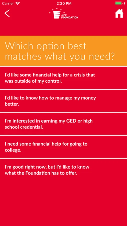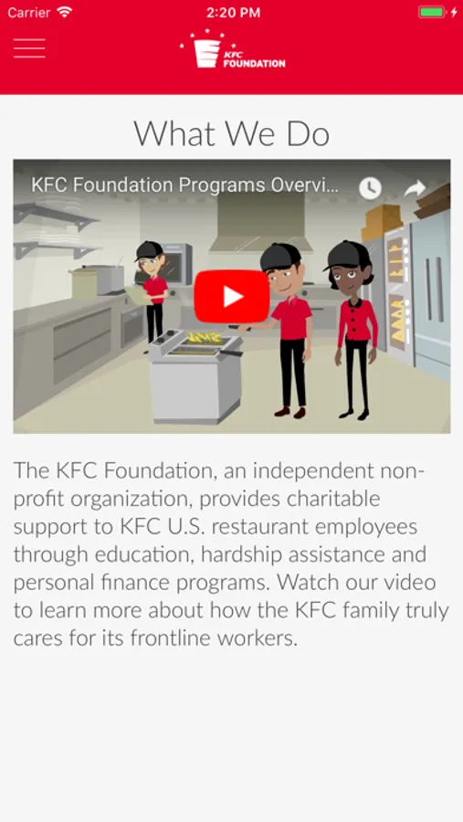 If you’re a KFC U.S. restaurant employee, determine which charitable program is best for you. From college grants and personal GED preparation to hardship assistance and personal finance tools, the KFC Foundation is a nonprofit organization focused exclusively on serving eligible frontline workers across the country. Complete a brief questionnaire and then get connected to the program you need today.