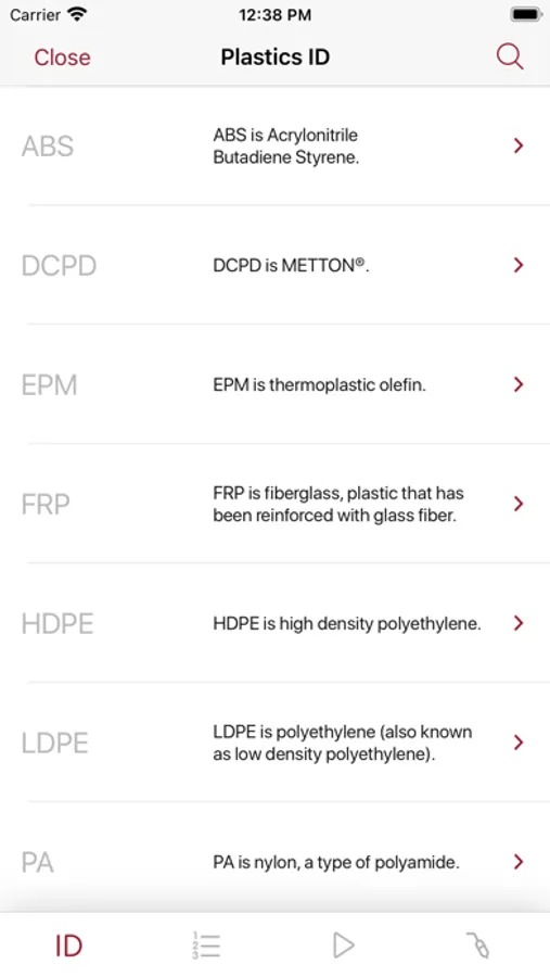 The "Plastics Identification" section lists out the most common plastic identification symbols and details what they are, where they are found, and how to repair them. This section has a search function to allow you to more easily identify the plastic you are working with.