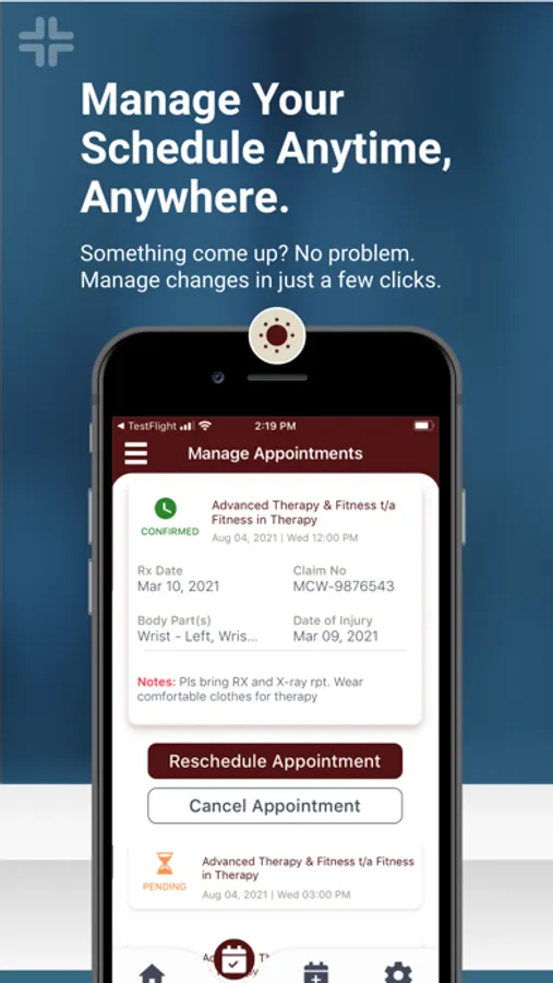 Manage your physical therapy schedule with ease using the Active Care Scheduling app. Once your initial appointment is scheduled, you’ll receive a registration pin to add your claim. Then, all your scheduled appointments are automatically added. No need to manually add weeks of appointments! You can even synch them to your calendar.
