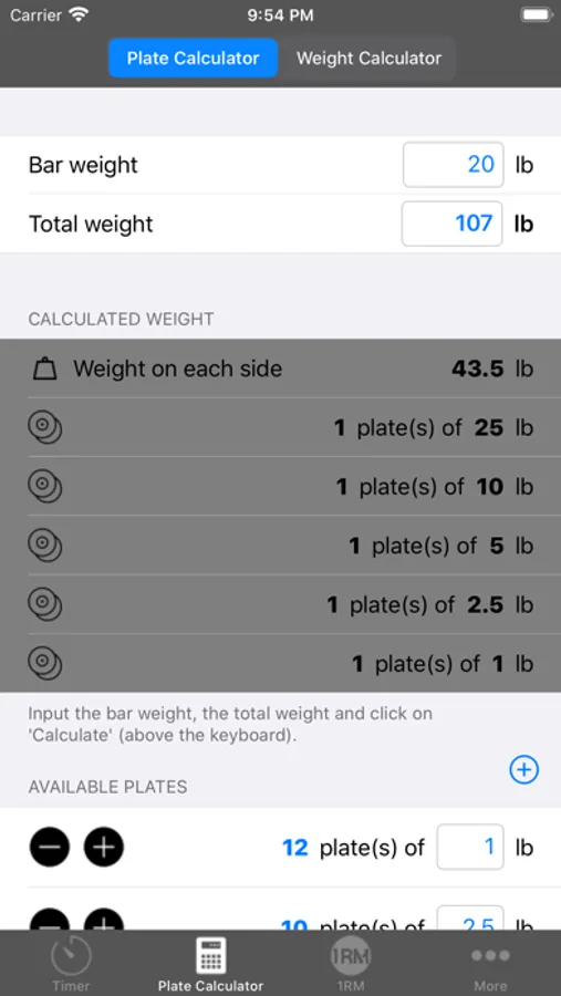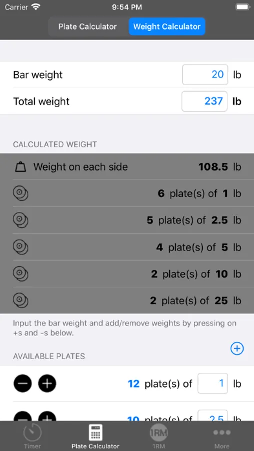 Modify the bar weight as simply as it is to input the total weight and to calculate which plates to put on each side of a bar, given a set of available plates (that you may customise).