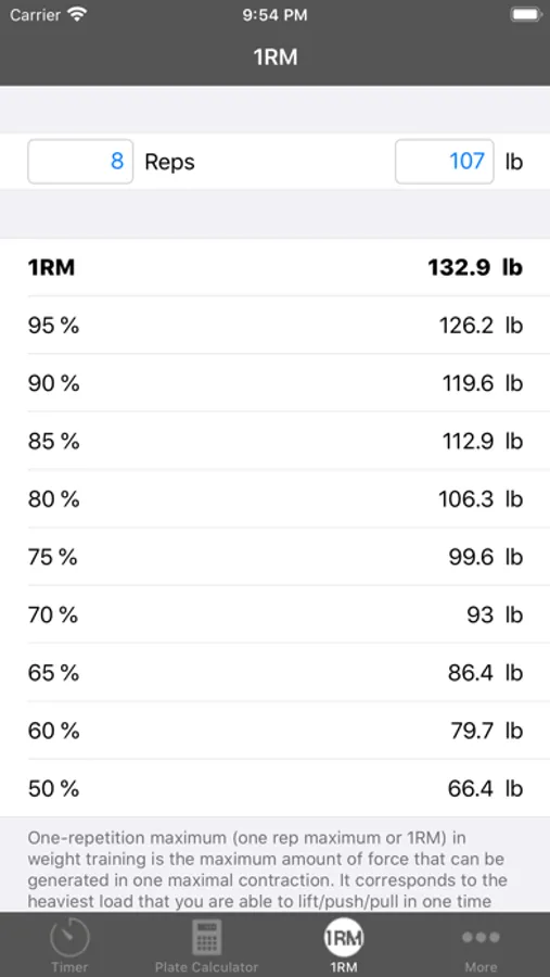 - A 1RM calculator (One-rep max): calculates 1RM corresponding to a certain number of reps and a given weight.