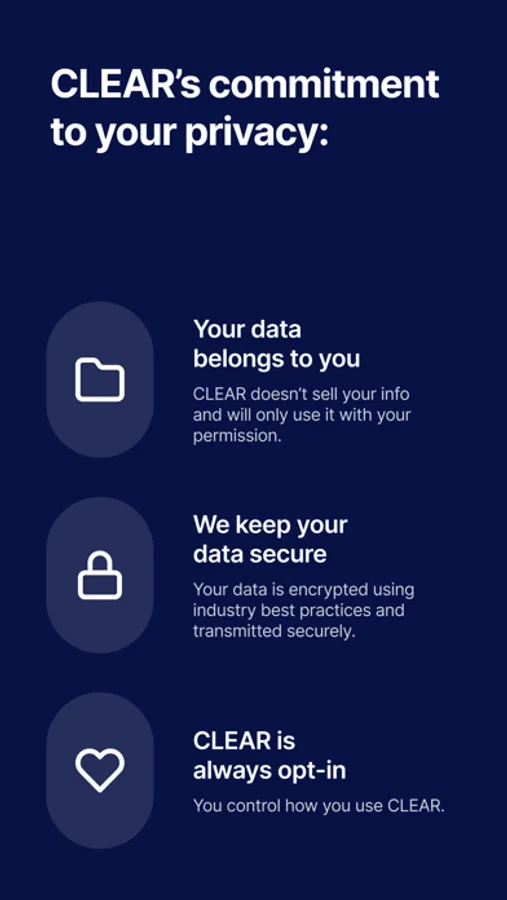 Using CLEAR is completely opt-in: we keep your data secure and protect your privacy. Transparency and security are at the center of everything we do—that means keeping you in control of your own personal information. You will know when CLEAR is asking for your information, what information we’re asking for, and how it will be used.