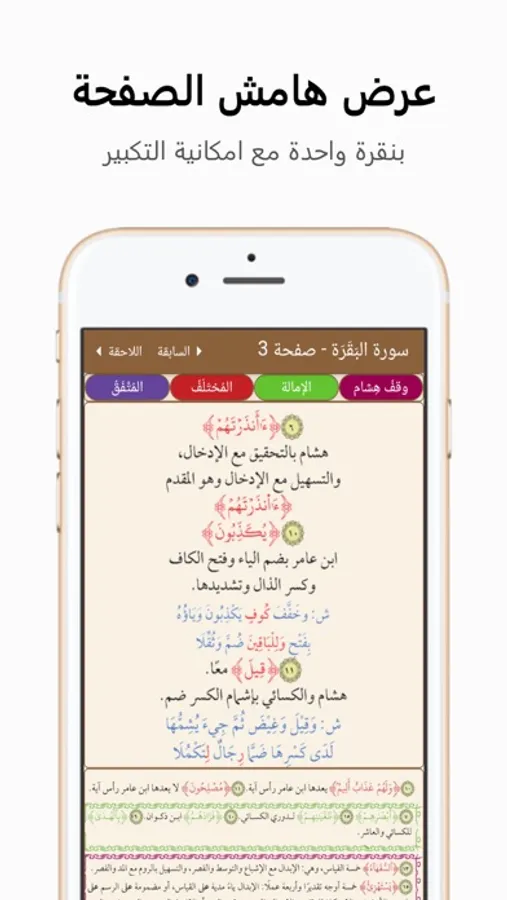 وأيضاً بيان الإمالة وووقف هشام وهاء التأنيث للكسائي بالألوان