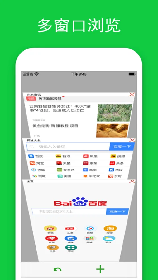 支持同时浏览多个网页,可以在新标签页打开新的网页,也可以在后台静默打开网页。