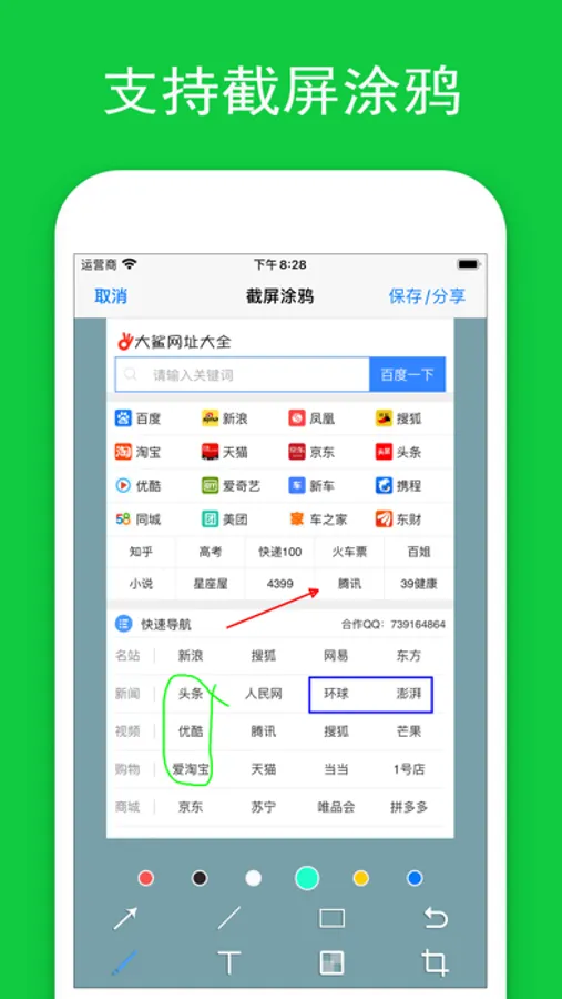 可以整屏截图后,任意编辑并涂鸦,也可以选择图片后,添加文字、图画、滤镜效果等。