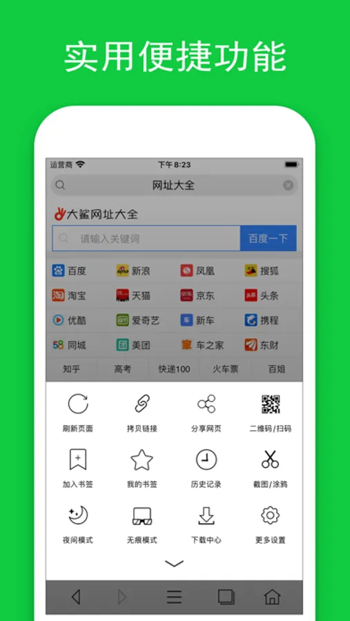 大鲨浏览器秉承极简的设计风格理念,海量的优质内容、强大的智能搜索、严格精选优秀网址,这一切是为了给您更专业的浏览体验! 大鲨浏览器内存小巧、安全稳定可靠,让你使用浏览器更自由更享受!
