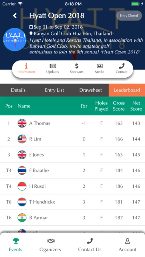 With this app, Organizers on GOLF CITIZEN Events can easily showcase their Tournaments to players and other interested users. Apart from the various Tournaments and their locations, the entry list, the drawsheet and the live leaderboard for these tournaments are also available from within the app.