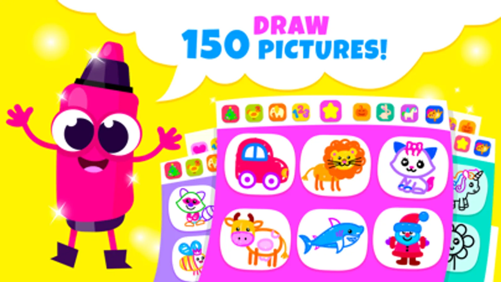 - 150 step-by step drawing tutorials in 10 thematic sets with different complexity levels for kids aged 2 to 6