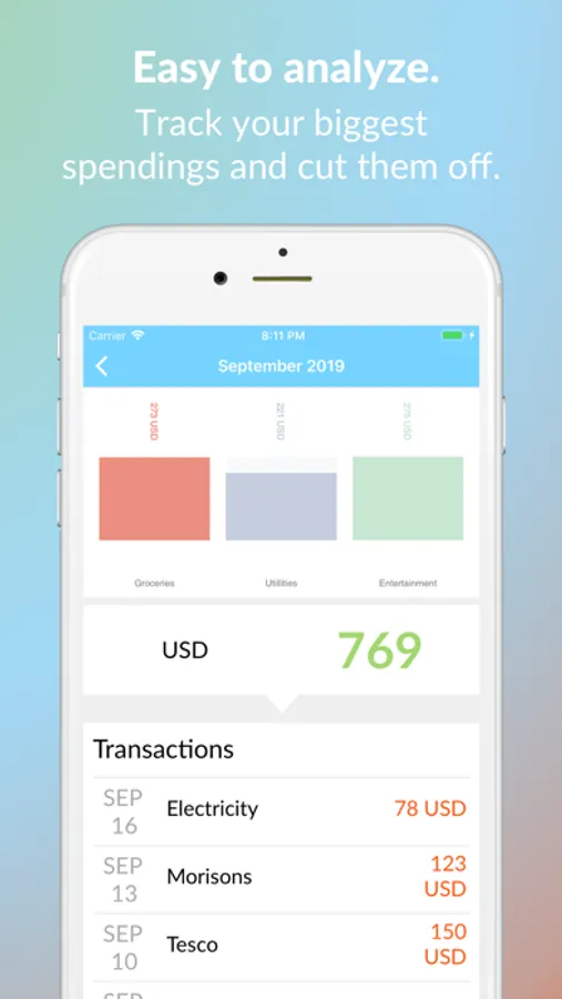 Budgetr tells you how much you left to spend this month. This way you can keep the expenses down and not overcome the budget, which will allow you to save money and buy the things that you want.