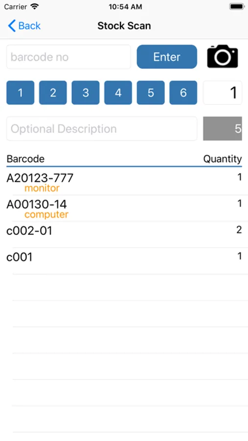 This apps can use iPhone camera as barcode scanner. It can scan barcode or QR-code. If you have USB barcode scanner with "USB to lightning cable" or blue-tooth scanner. Please connect your iPhone to the scanner. Newer USB barcode scanner have less USB current problem.
