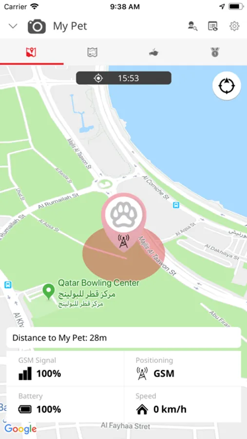 Location and status - monitor the present location and the status the of MyKi Pet tracker Powered by Ooredoo.