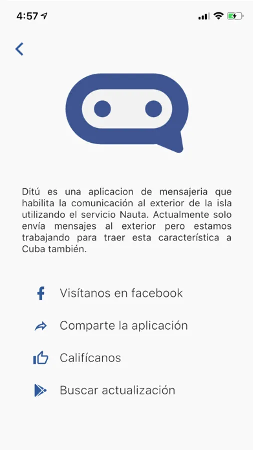 Ditu esta diseñado para enviar y recibir mensajes con Cuba, aun cuando los usuarios no tienen Internet. Ditu utiliza mensajería SMS para la mayoría de sus transacciones, lo que significa que los mensajes van a llegar a sus recipientes de manera instantánea. Desde Cuba, solo es requerido tener conexión a los datos móviles para enviar mensajes. Ya que la mayoría de la comunicación es a través de SMS, usted no necesita que su recipiente tenga Ditú instalado para recibir mensajes.