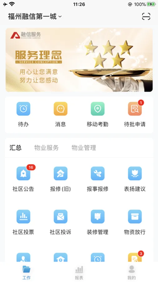 融e帮APP是为物业管理服务人员提供的一款作业工具,客户在融e居APP上提出需求,物业服务人员通过融e帮APP接收需求并提供相应服务,所有工单服务全流程监控,量化了员工日常工作,从而提升物业管理效率。