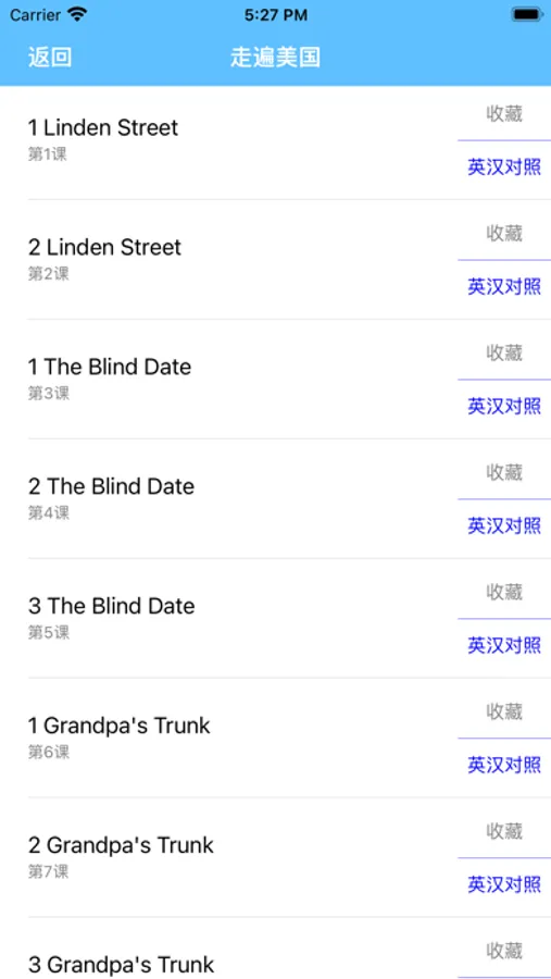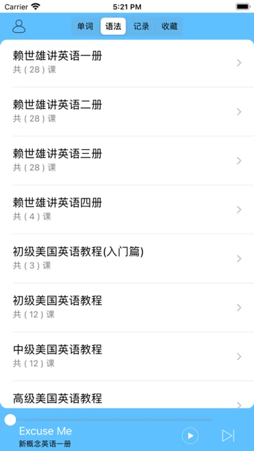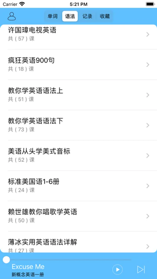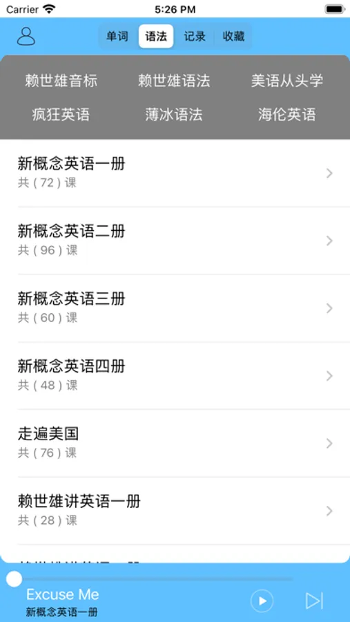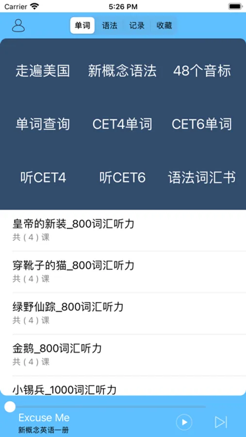 拥有数据收藏,本地数据缓存,删除,播放记录等功能。包含:走遍美国,新概念英语,英语语法,美式音标,