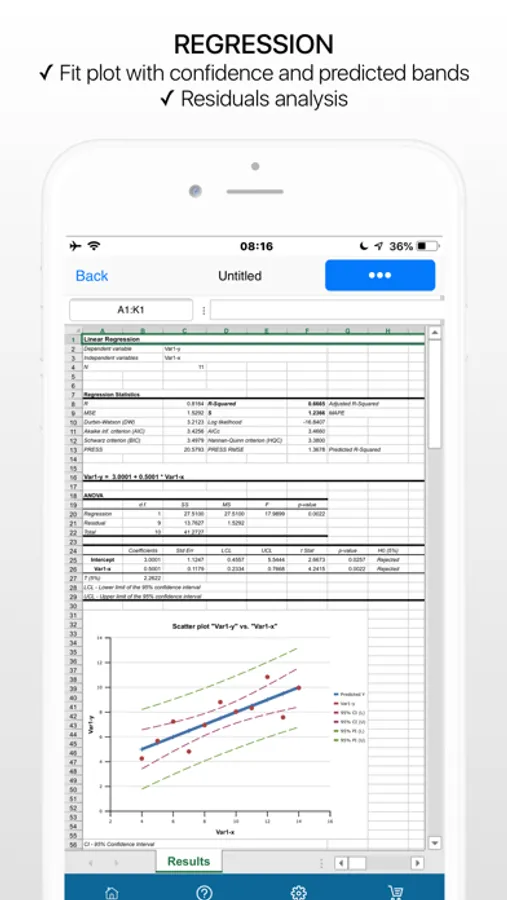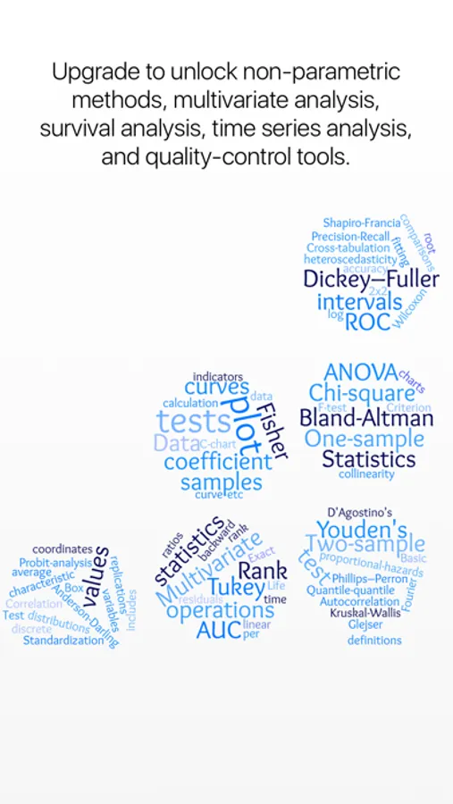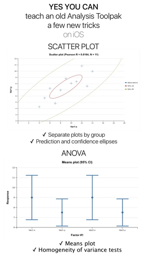 StatPlus allows iOS users to perform various methods of data analysis from the basic to complex analysis, including non-parametric analysis, ANOVA (with post-hoc tests), regression analysis (includes residuals analysis, heteroscedasticity tests, collinearity diagnostics), survival analysis (probit analysis and LD50 calculation, ROC curves analysis and comparison, life tables and Kaplan-Meier), time series analysis (autocorrelation function analysis, unit root tests), quality control (capability analysis, control charts) and other methods and visualizations.