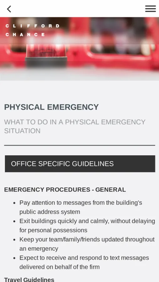 •Physical Emergency - valuable guidelines for all Clifford Chance offices, including evacuation procedures and maps of assembly points
