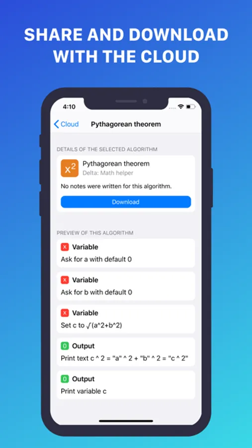 - Save your algorithms on your device, share then on the Cloud, or download ready-to-use algorithms shared by other people