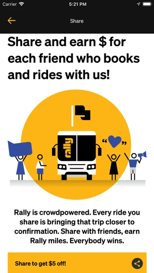Rally makes it easier than ever to get a big group of people together. Create your own route, and share the unique link among your friends or in your organization. Cover the cost of the trip yourself or use our crowdfunding tools to split the cost. No individual has to be responsible alone -- your ride is confirmed once enough people sign up!