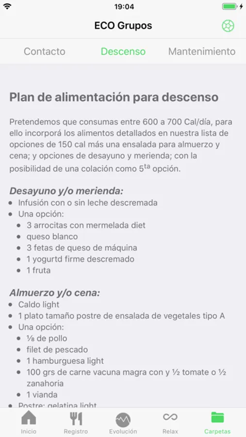 Aplicación que permite a los pacientes de los grupos de ECO llevar un control de su alimentación diaria, su evolución de peso y mantenerse informados de las novedades de la institución.