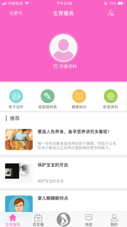 首页:可以查看有关妇幼的健康知识以及电子证件和体检有关的信息;