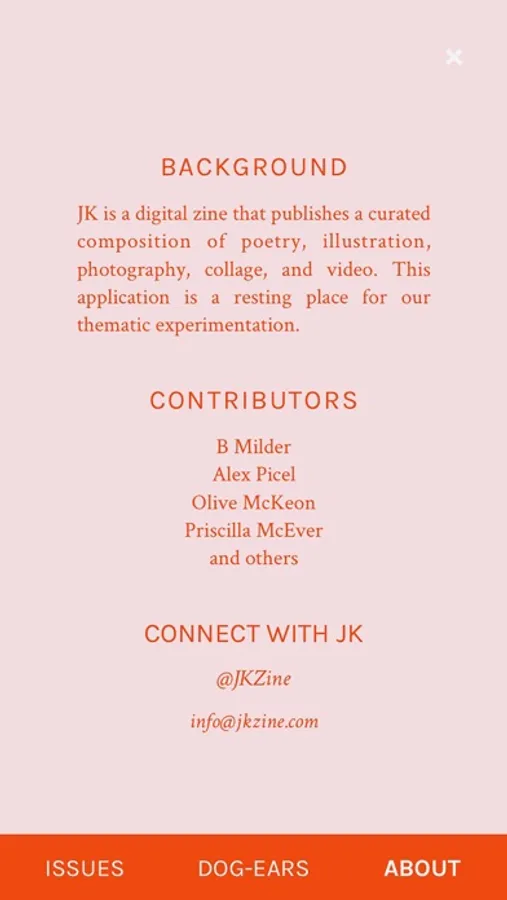 JK Zine is a digital periodical that publishes work from emerging artists in an experimental layout.