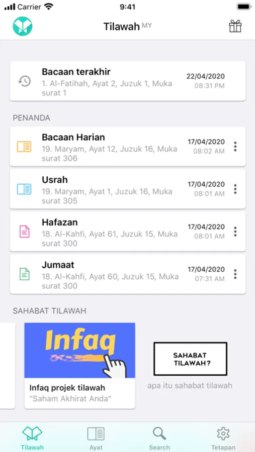 Mark the last verse reading as a reference, and return to the marked verse each time you open this Quran application.