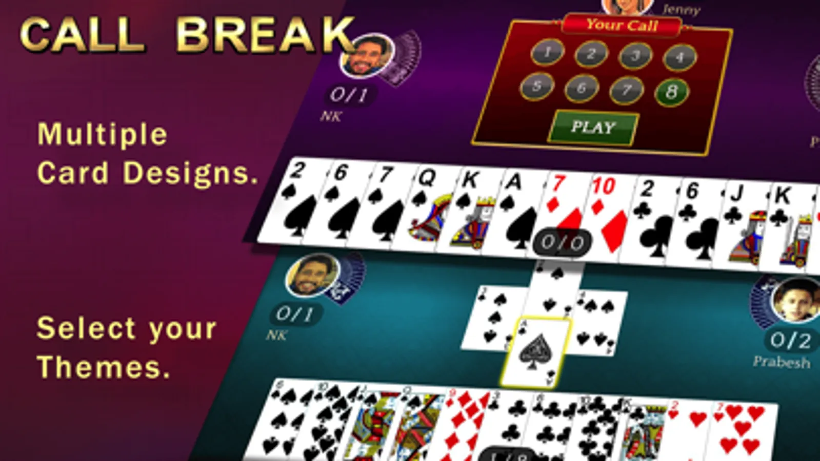 Call Break, pronounced 'kalbreak' is a relatively long-run game played with 52 cards deck between 4 players with 13 cards each. It's game rules are pretty easy to learn.