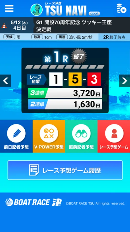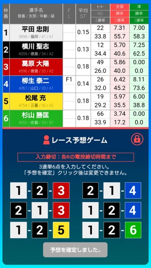 3連単の出目予想ゲームです。通常5・12R、準優戦日は5・10・11・12Rの予想ができます。予想が的中した場合、ポイントをゲットでき、その獲得ポイントに応じてプレゼント応募ができます。