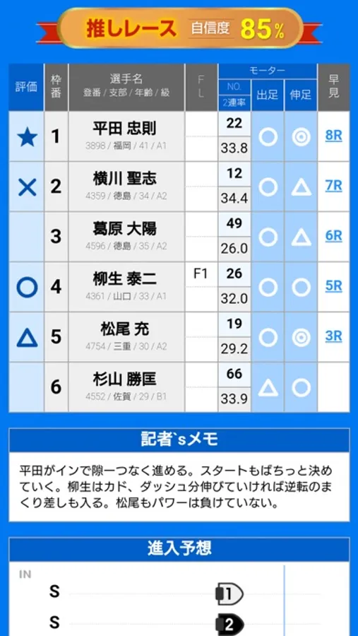 レース前日にボートレース津担当記者の選手評価、モーター評価のほか、寸評、進入予想がご覧いただけます。