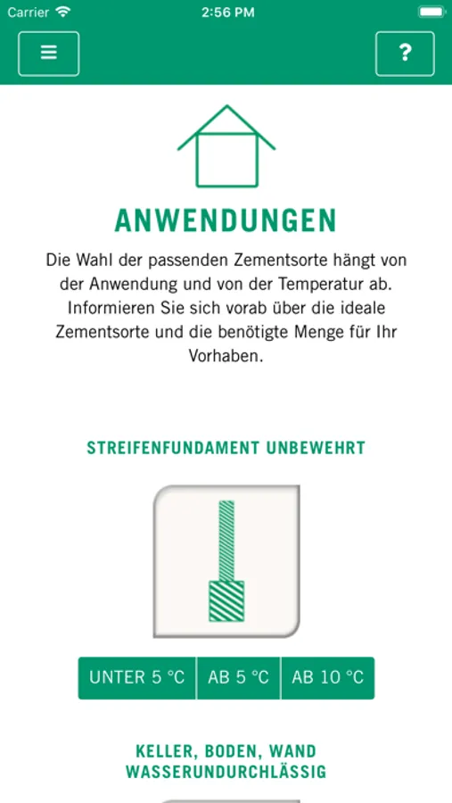 Das Herzstück ist das Kalkulationstool, mit dem die optimale Betonrezeptur mit wenigen Klicks ermittelt werden kann. Je nach Anwendung ermittelt der Rechner die benötigte Zementsorte und Menge an Zement, Gesteinskörnung sowie Wasser. Zuerst wählt man die Anwendung und Temperatur aus und gibt die Maße des Bauvorhabens oder das benötigte Gesamtvolumen an. Die App ermittelt die passende Zementsorte, die benötigte Materialmenge für das gesamte Bauvorhaben sowie die Aufteilung der Menge pro Mische. Das ermittelte Ergebnis kann per E-Mail oder über andere Messenger Dienste geteilt werden.