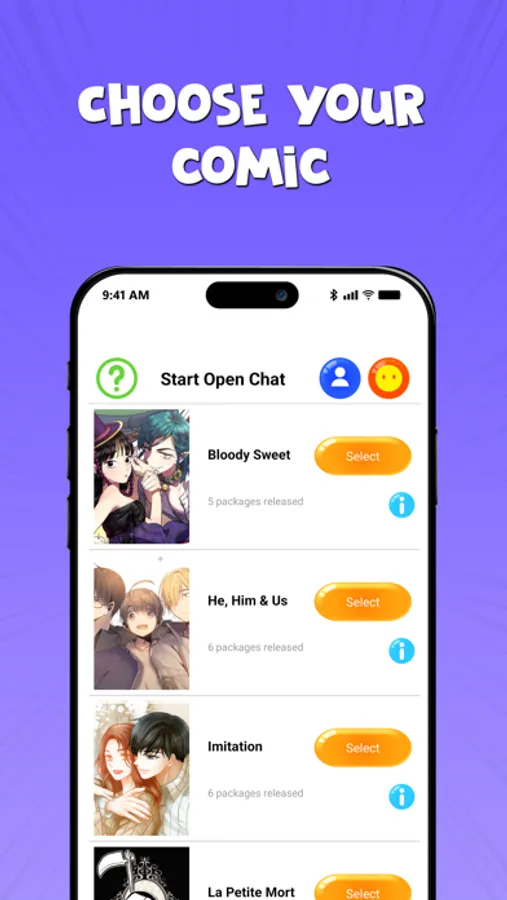 For each series, choose among up to twelve different packages. Each package includes panels and heroes from a specific scene of the series. Select the package according to the scene and heroes you want to use. Select the package according to the mood of the conversation you want to start: flirting, action, fighting, etc.