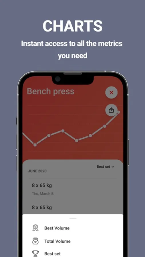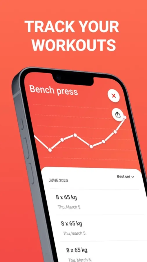 Check your progress over time with our charts. Nothing is more motivating than seeing your own improvement. Every time you go to the gym, you will know how well you performed last time.