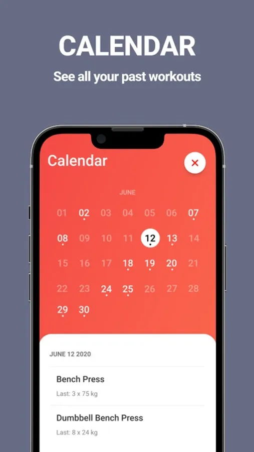 Another way to get motivated is to see how often you've worked out this week or month. We included a calendar that shows exactly that. You can quickly overview your past workouts and see exactly what exercises you performed on a specific day.