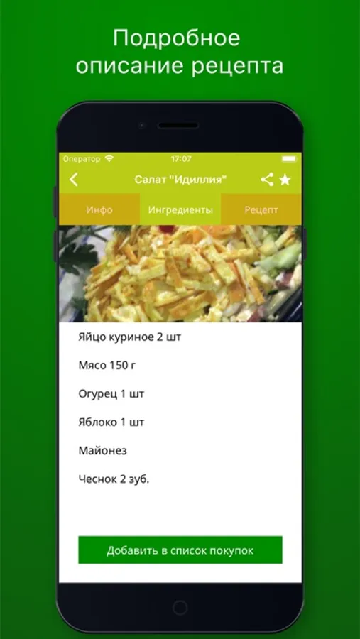Зачем писать на листике перечень продуктов, если можно добавить их в список покупок! Это практично и занимает мало времени. Все, что вам нужно - найти понравившийся рецепт, нажать "Добавить с список покупок" и все нужные ингредиенты сохранены. Теперь вы можете легко делать покупки, ничего не забыв !