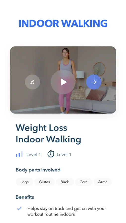 - Indoor and outdoor walking. Watch useful walking video workouts for every fitness level to get fit indoor or outdoor.