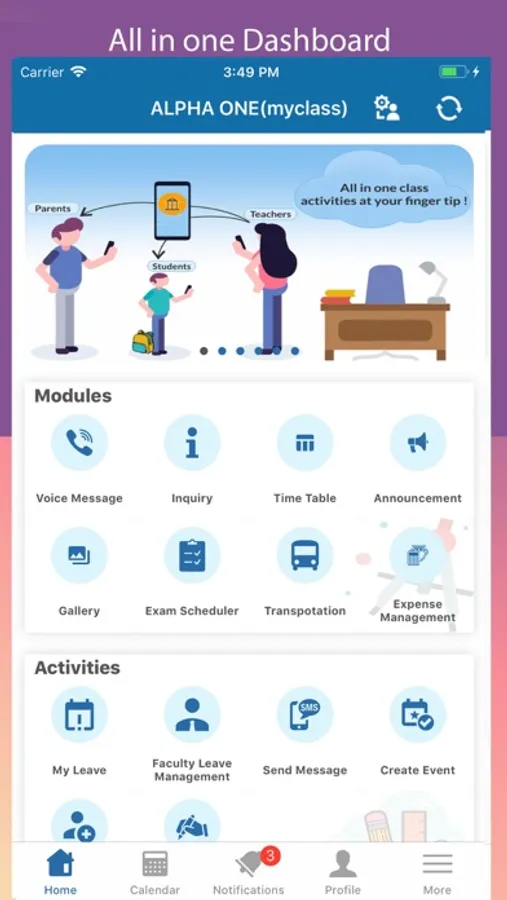 A Pool between Student, Parent, Teacher & Admin: Online tests, spot results, Calendar, Live notice board, discussion, and many more...