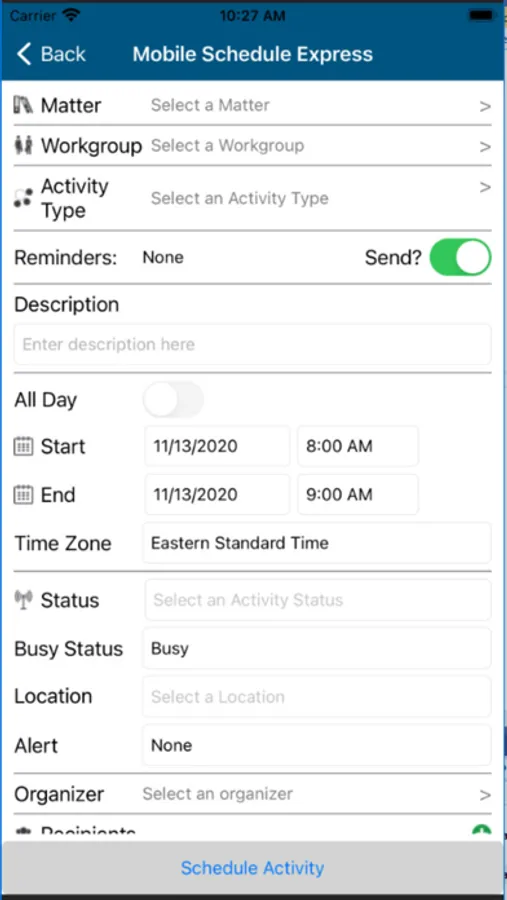 Use Docket Mobile app to add a new activity or task to the schedule for any matter, or to modify any activity or task that is standalone (not tied to a parent activity or dependent activity or task.)