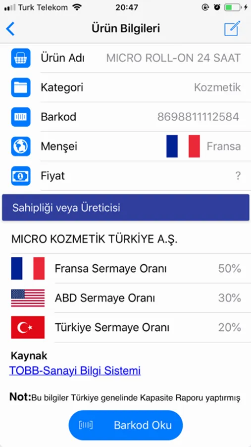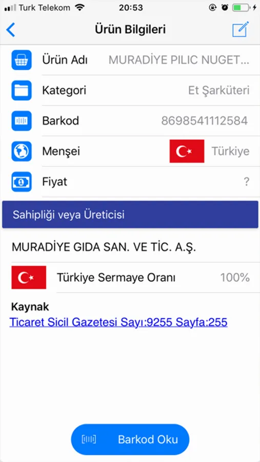 Ürün Sicil uygulaması ile marketlerde satılan ürünlerin barkodlarını kameraya taratarak menşei yani ürün üretildiği ülke, üreten üretici veya sahipliğine sahip firma, üreticisi veya sahipliğine sahip firmanın bünyesindeki yerli ve yabancı sermaye oranı gibi en temel bilgilere kaynaklı bir şekilde erişebileceksiniz. Bilgi güncellemesi yapıldıkça ürünün diğer marketlerdeki fiyatları, miktar bilgisi, fiyat/miktar oranı, gıda maddelerinin içerikleri, kalori vs bilgilere, ürün hakkında diğer tüketicilerin bırakmış olduğu yorumlar ve puanlar gibi bilgilere erişebileceksiniz.