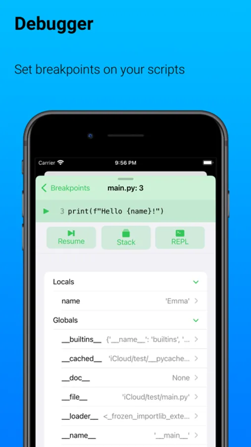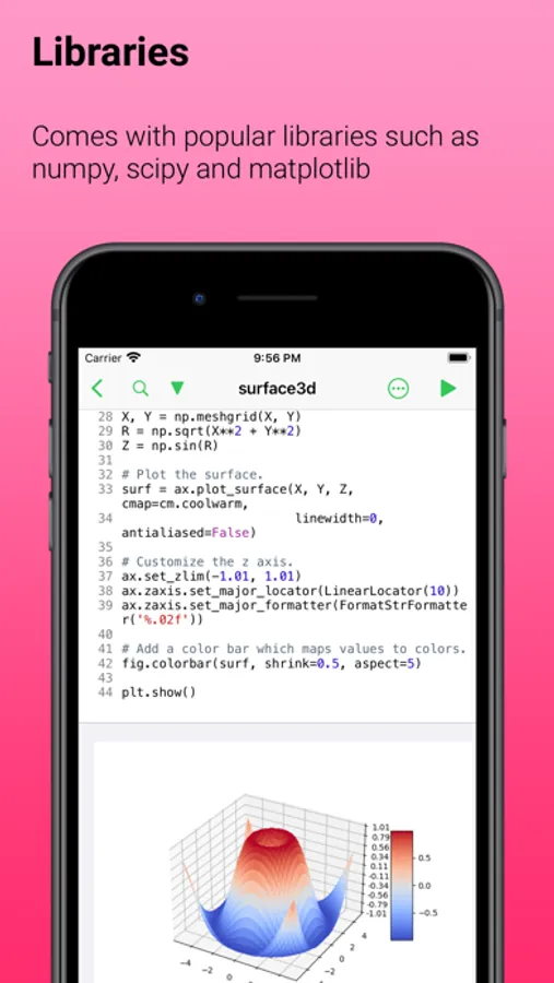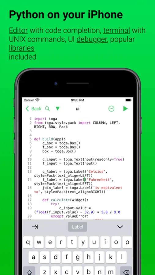 Pyto is an IDE for iPhone and iPad with a Python 3.10 Interpreter and all of the standard libraries plus more than 100 third party packages, as well as a C & C++ compiler and bitcode interpreter. Includes a terminal with standard UNIX commands, a code editor with code completion, support for Shortcuts, Picture in Picture, a graphical interface builder and a debugger.
