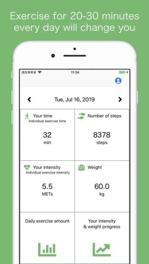 What many of us don't know is that just walking will not really help improve our physical fitness. Maintaining and improving overall fitness is important to live a long life in good health*, but walking alone will not get you there. However, there is no need for hard exercise either. This app will estimate just the right intensity of exercise for you and record your daily exercise time.